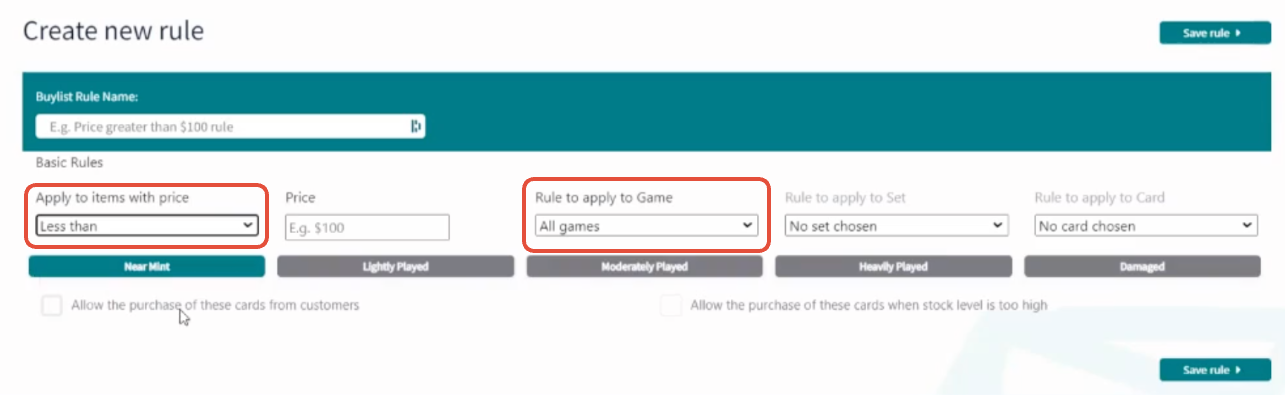 Please also note that you will need to customize your specific rule for each rarity; you can manage and edit each of these rules by selecting the respective rarity. You do not need to create a new rule for each rarity. You can save your parameter for all five rarities under the same rule; simply click between the rarities to view their respective restrictionsAllow the purchase of these cards from customers