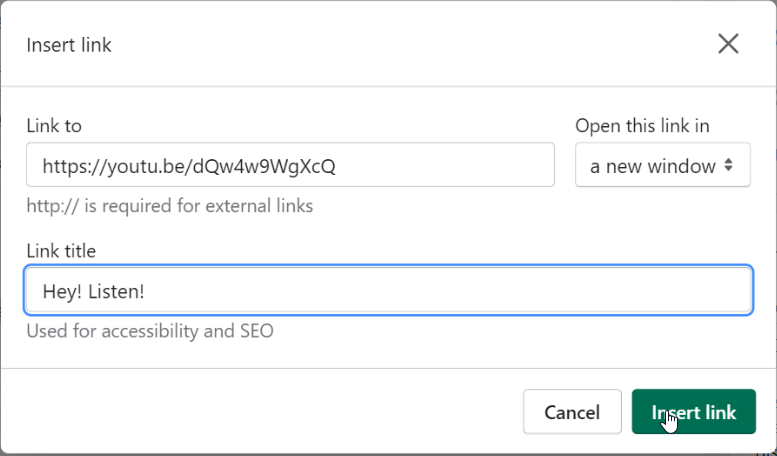 - Enter the linked web address in the Link To field. Utilize the descriptive Link Title to help with search engine optimization