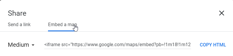 - Choose the desired map size, then copy the code to embed. The HTML code begins with <iframe src=.