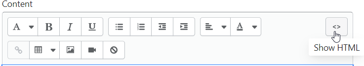HTML codes on your webpages can also be customized by selecting the Show HTML button to view and make any necessary changes. That will look like this: