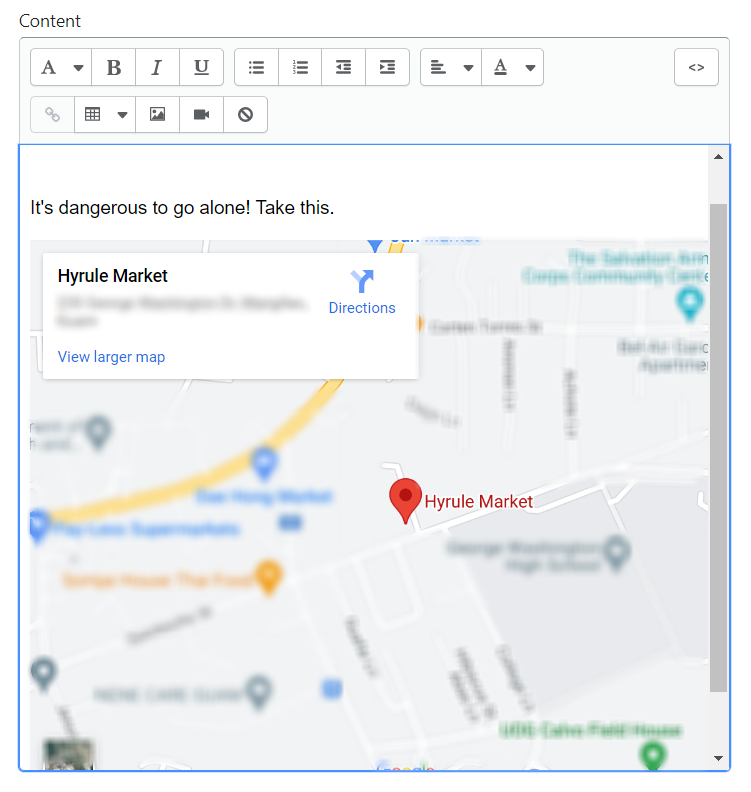 - Paste your Google Map code into the Content section. Placement of this code will determine its location on your store's page. Pasting this code before any previously added content will place the map at the top of the page. Pasting it after will display the map at the bottom of your store's page