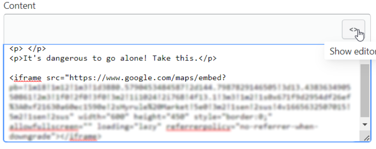 - Select Show Editor to switch back to the standard webpage editor and see the embedded map