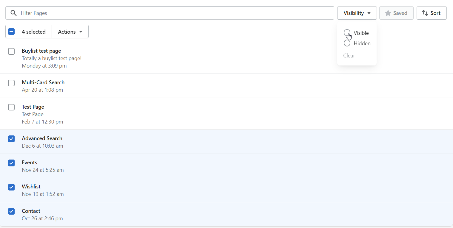 - Once pages have been highlighted, select the drop-down arrow next to Visibility and select Visible