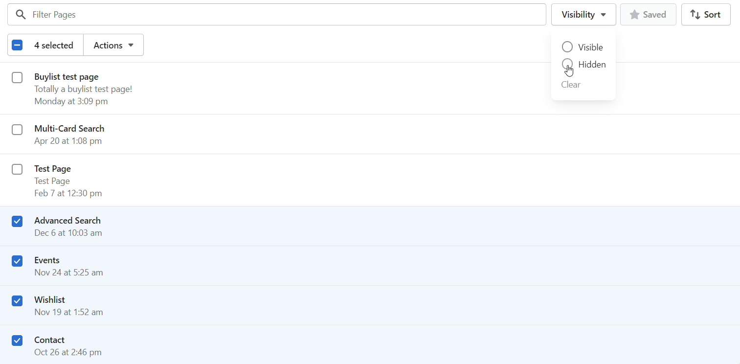 - Under the Visibility section, select the publication date. Select Hidden if you wish to keep the page invisible after publishing; if not set to hidden, this page will be visible as soon as you click Save