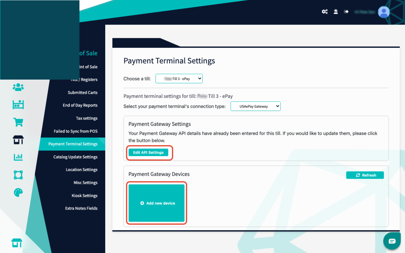 After entering API settings, a new payment terminal can be added by selecting Add New Device