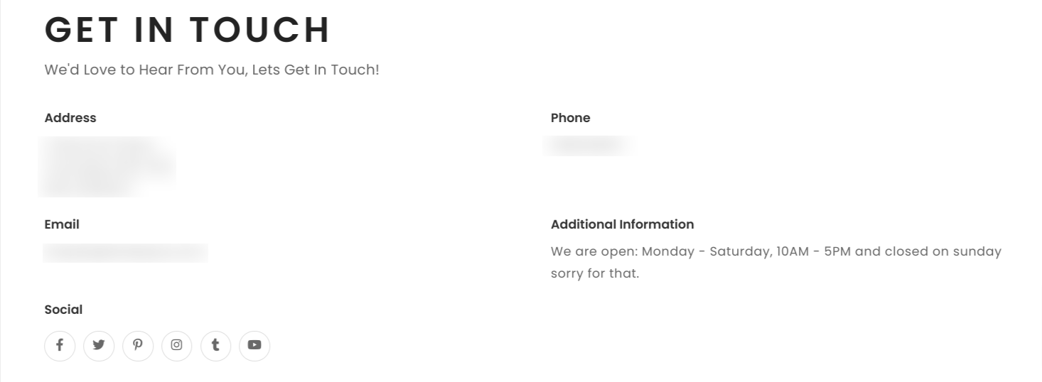 - The Contact Page allows for store hours and contact information to be displayed for customers