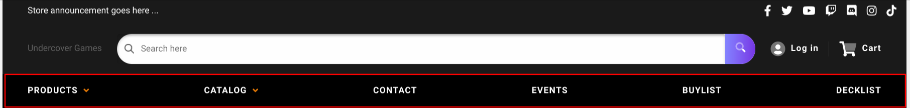 - The Header includes several differing customizable sections appearing at the very top of the store's theme. For example, customers will see the Store Logo and Main Menu here