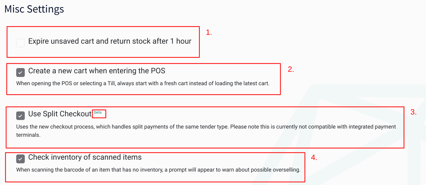 Under the Miscellaneous Settings, your store will find further levels for customization of your store's Point of Sale. This article will focus on briefly explaining and listing how to use and adjust these features. These settings can be divided into two sections: General Misc Settings and Extra POS Payment Methods.