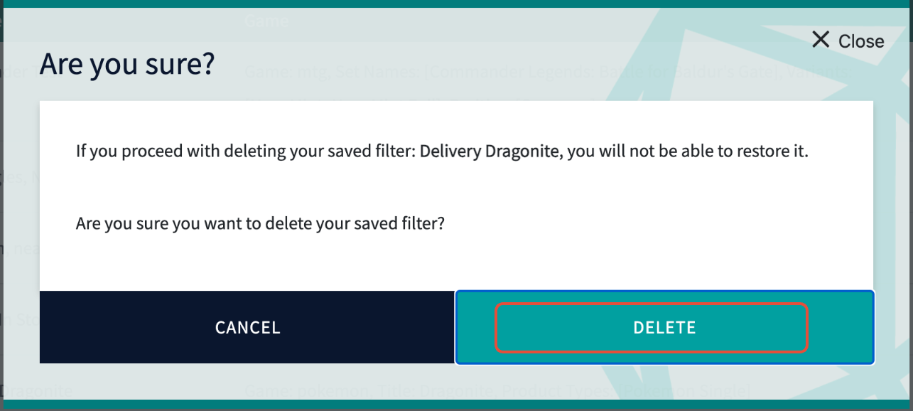 - Following this, a pop up prompt titled Are you sure? will appear to confirm that the custom filter is wanting to be deleted. In order to continue with deleting this filter, select Delete; to keep the filter, select Cancel